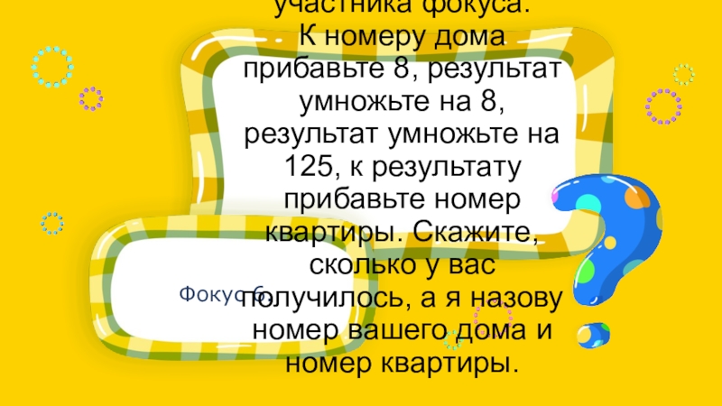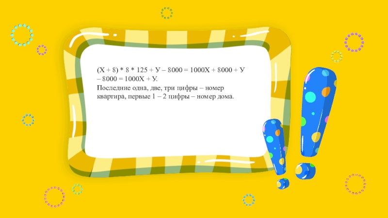 8, результат умножьте на 8, результат умножьте на 125, к результату прибавьте номер квартиры. Скажите, сколько у вас получилось, а я назову номер вашего дома и номер квартиры.