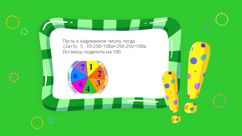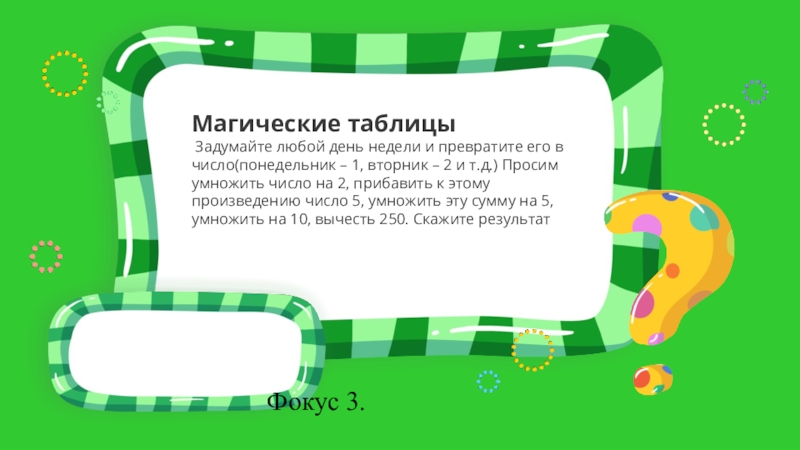 число(понедельник – 1, вторник – 2 и т.д.) Просим умножить число на 2, прибавить к этому произведению число 5, умножить эту сумму на 5, умножить на 10, вычесть 250. Скажите результат