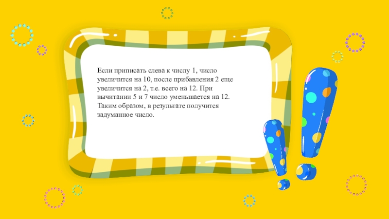 прибавления 2 еще увеличится на 2, т.е. всего на 12. При вычитании 5 и 7 число уменьшается на 12. Таким образом, в результате получится задуманное число.