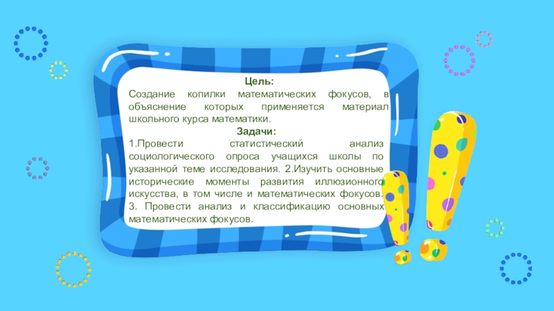 1.Провести статистический анализ социологического опроса учащихся школы по указанной теме исследования. 2.Изучить основные исторические моменты развития иллюзионного искусства, в том числе и математических фокусов. 3. Провести анализ и классификацию основных математических фокусов.