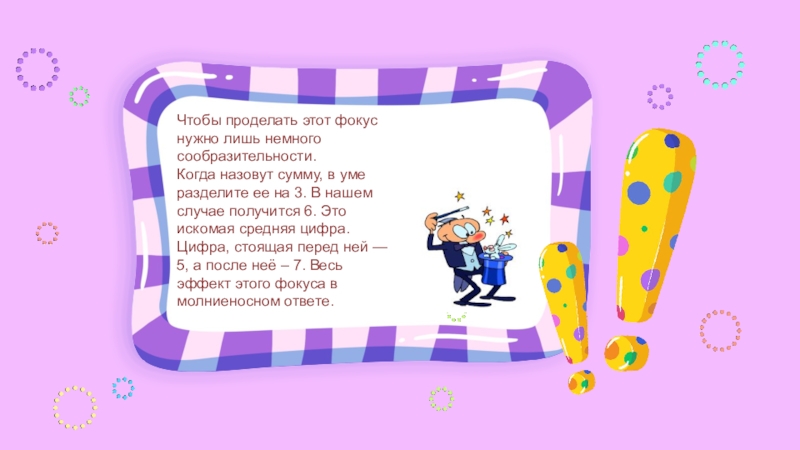 уме разделите ее на 3. В нашем случае получится 6. Это искомая средняя цифра. Цифра, стоящая перед ней — 5, а после неё – 7. Весь эффект этого фокуса в молниеносном ответе.