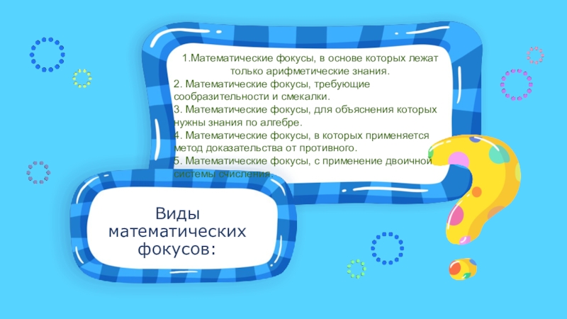 1.Математические фокусы, в основе которых лежат только арифметические знания.