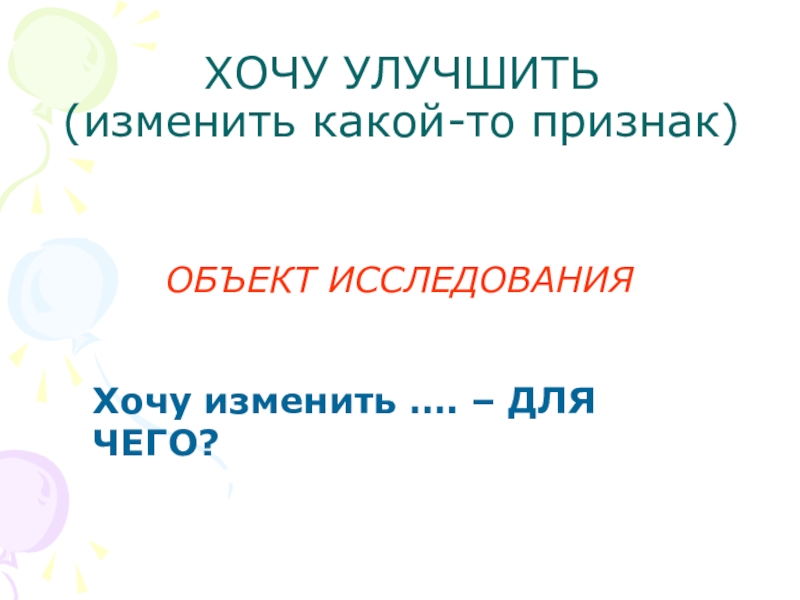 ХОЧУ УЛУЧШИТЬ  (изменить какой-то признак)Хочу изменить …. – ДЛЯ ЧЕГО?ОБЪЕКТ ИССЛЕДОВАНИЯ