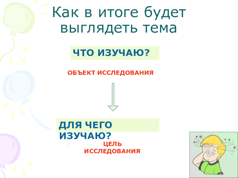 Как в итоге будет выглядеть темаЧТО ИЗУЧАЮ?ОБЪЕКТ ИССЛЕДОВАНИЯДЛЯ ЧЕГО ИЗУЧАЮ?ЦЕЛЬ ИССЛЕДОВАНИЯ