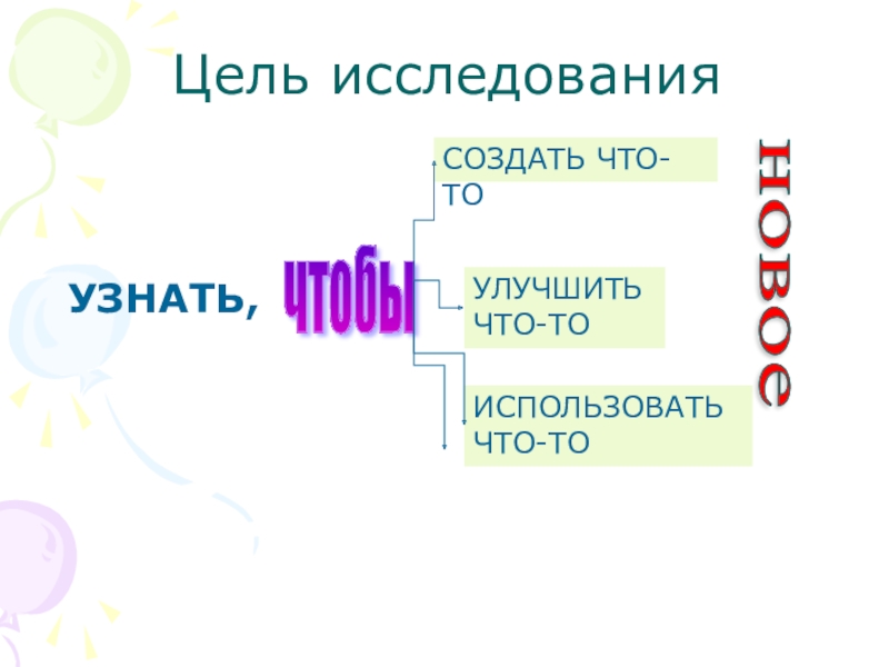 Цель исследованияУЗНАТЬ, СОЗДАТЬ ЧТО-ТОУЛУЧШИТЬ ЧТО-ТОИСПОЛЬЗОВАТЬ ЧТО-ТОчтобы новое
