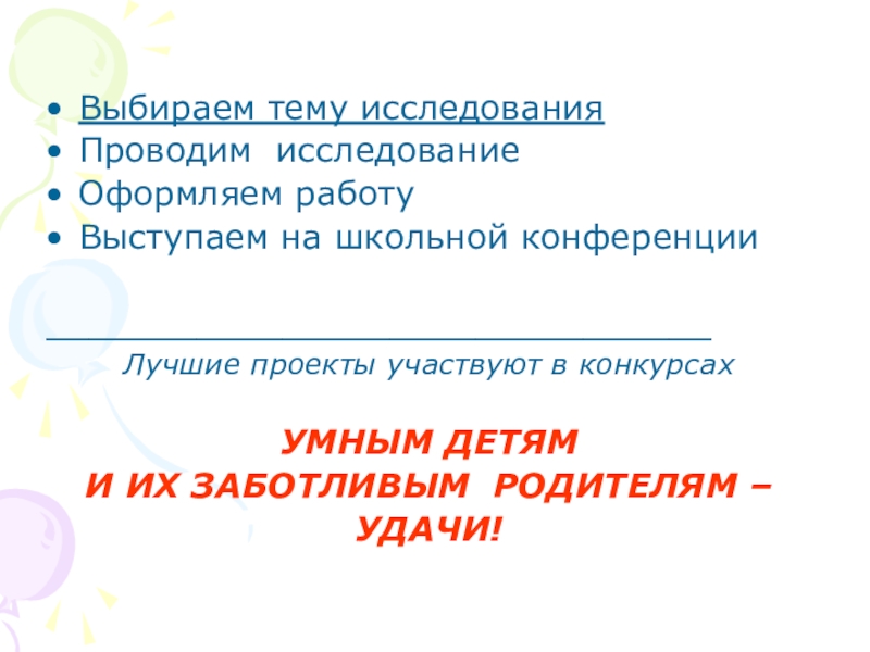 Выбираем тему исследованияПроводим исследованиеОформляем работуВыступаем на школьной конференции_______________________________Лучшие проекты участвуют в конкурсахУМНЫМ ДЕТЯМ И ИХ ЗАБОТЛИВЫМ РОДИТЕЛЯМ