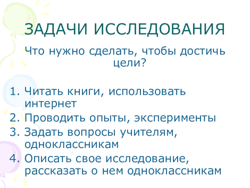 ЗАДАЧИ ИССЛЕДОВАНИЯЧто нужно сделать, чтобы достичь цели?Читать книги, использовать интернетПроводить опыты, экспериментыЗадать вопросы учителям, одноклассникамОписать свое исследование,