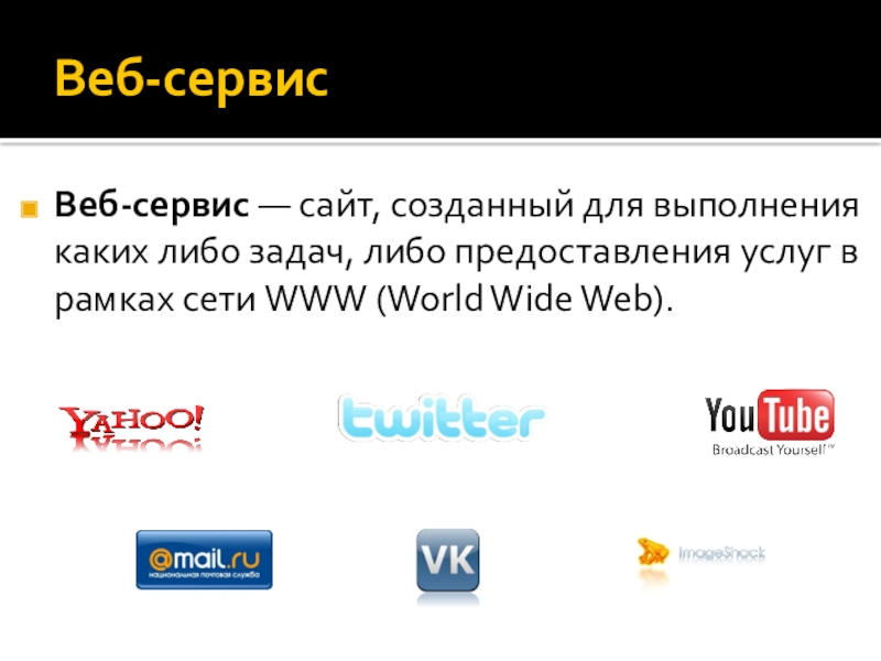 Веб-сервисВеб-сервис — сайт, созданный для выполнения каких либо задач, либо предоставления услуг в рамках сети WWW (World Wide
