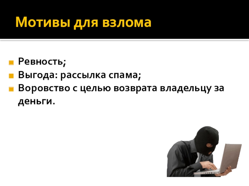 Мотивы для взломаРевность;Выгода: рассылка спама;Воровство с целью возврата владельцу за деньги.