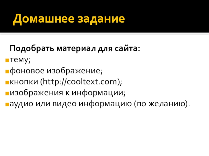 Домашнее заданиеПодобрать материал для сайта: тему; фоновое изображение; кнопки (http://cooltext.com); изображения к информации; аудио или видео информацию