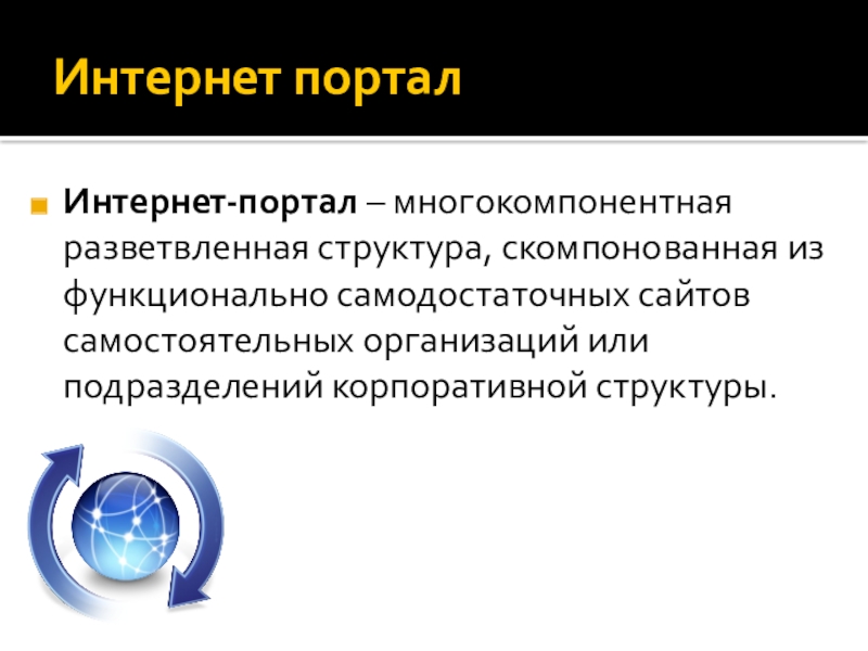 Интернет порталИнтернет-портал – многокомпонентная разветвленная структура, скомпонованная из функционально самодостаточных сайтов самостоятельных организаций или подразделений корпоративной структуры.