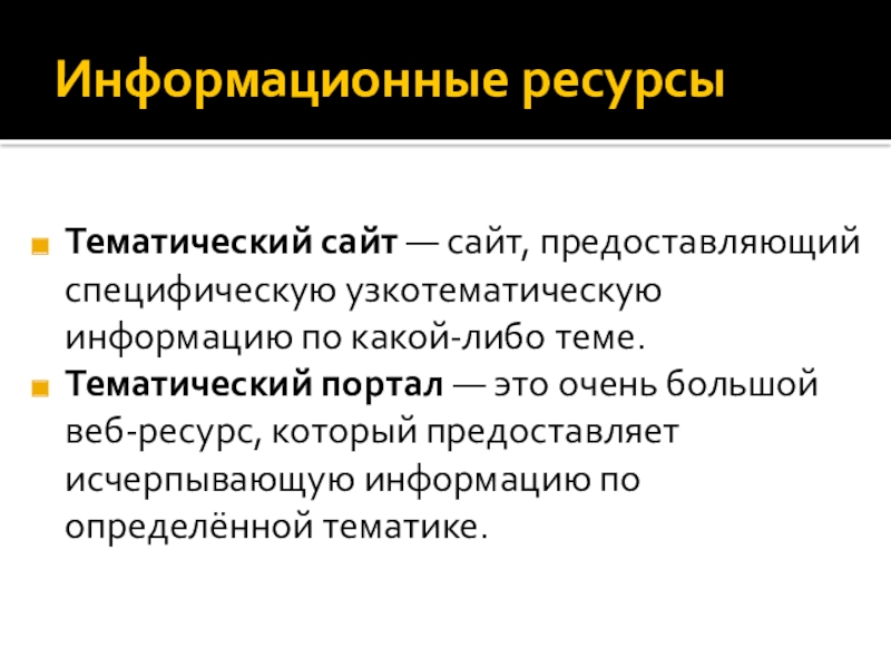 Информационные ресурсыТематический сайт — сайт, предоставляющий специфическую узкотематическую информацию по какой-либо теме.Тематический портал — это очень большой веб-ресурс, который