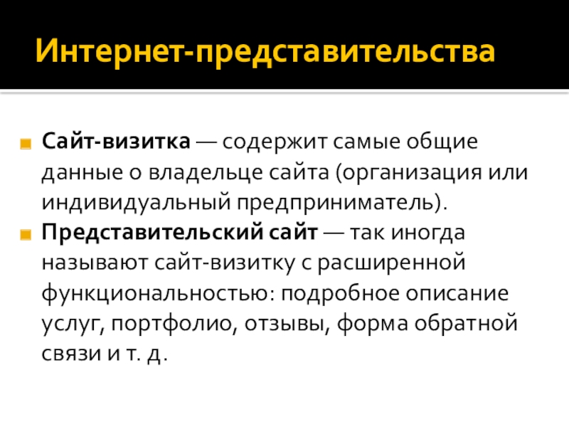 Интернет-представительстваСайт-визитка — содержит самые общие данные о владельце сайта (организация или индивидуальный предприниматель). Представительский сайт — так иногда называют