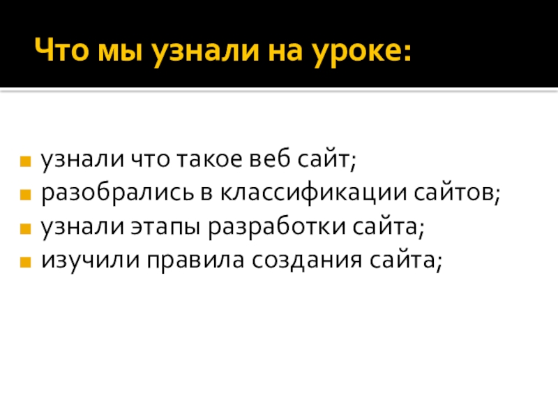 Что мы узнали на уроке:узнали что такое веб сайт;разобрались в классификации сайтов;узнали этапы разработки сайта;изучили правила создания