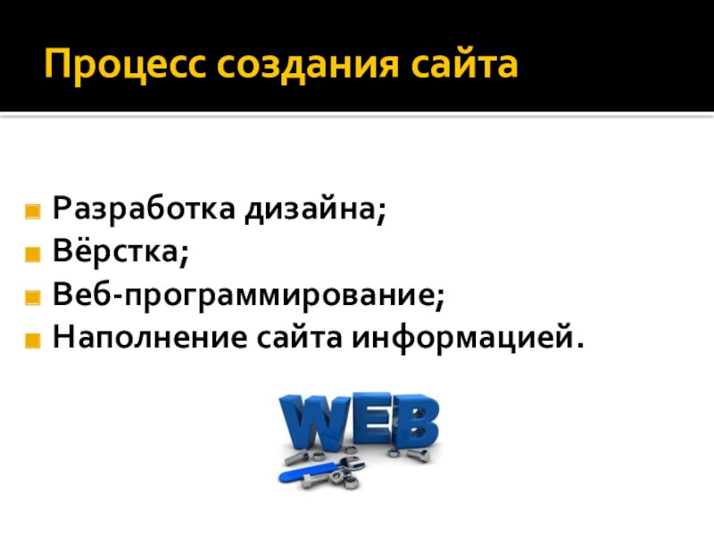 Процесс создания сайтаРазработка дизайна;Вёрстка;Веб-программирование;Наполнение сайта информацией.