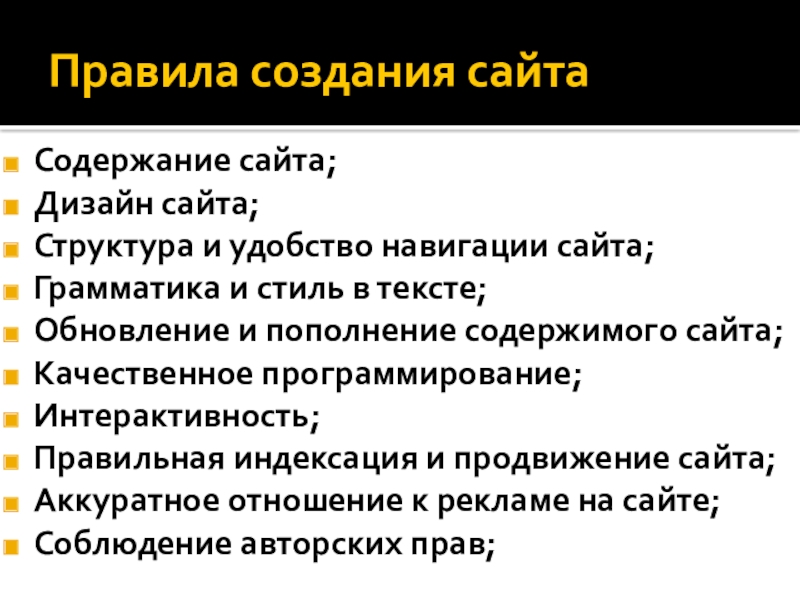 Правила создания сайтаСодержание сайта;Дизайн сайта;Структура и удобство навигации сайта;Грамматика и стиль в тексте;Обновление и пополнение содержимого сайта;Качественное