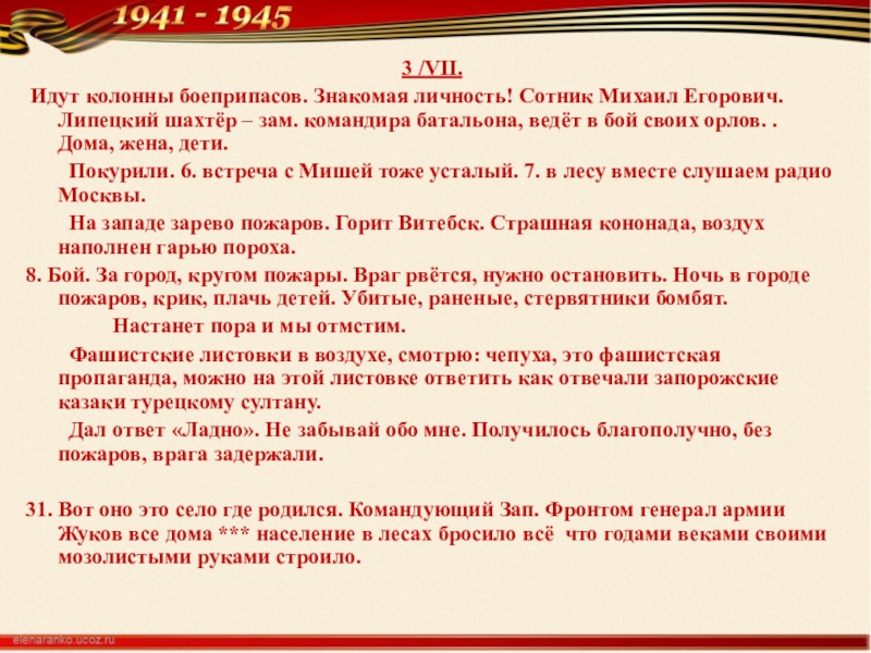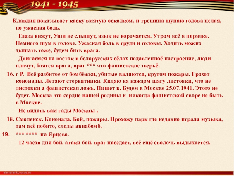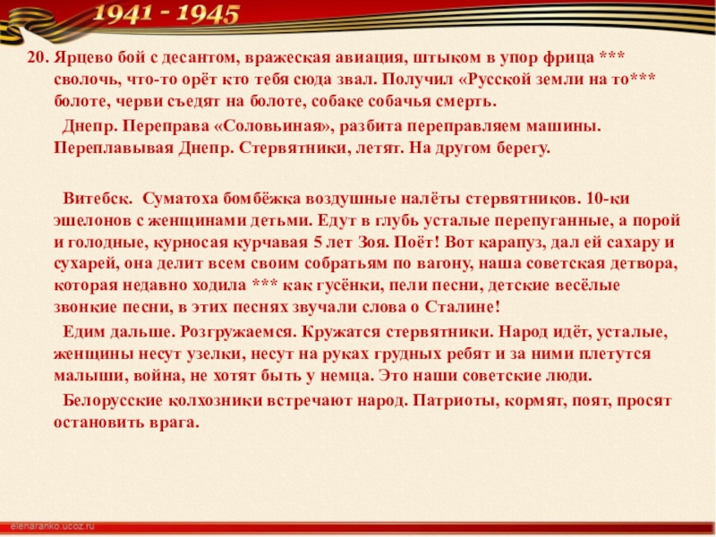 Витебск. Суматоха бомбёжка воздушные налёты стервятников. 10-ки эшелонов с женщинами детьми. Едут в глубь усталые перепуганные, а порой и голодные, курносая курчавая 5 лет Зоя. Поёт! Вот карапуз, дал ей сахару и сухарей, она делит всем своим собратьям по вагону, наша советская детвора, которая недавно ходила *** как гусёнки, пели песни, детские весёлые звонкие песни, в этих песнях звучали слова о Сталине!