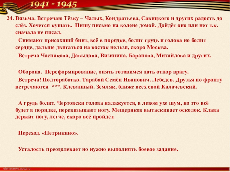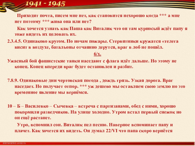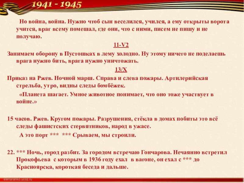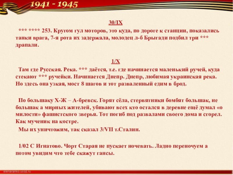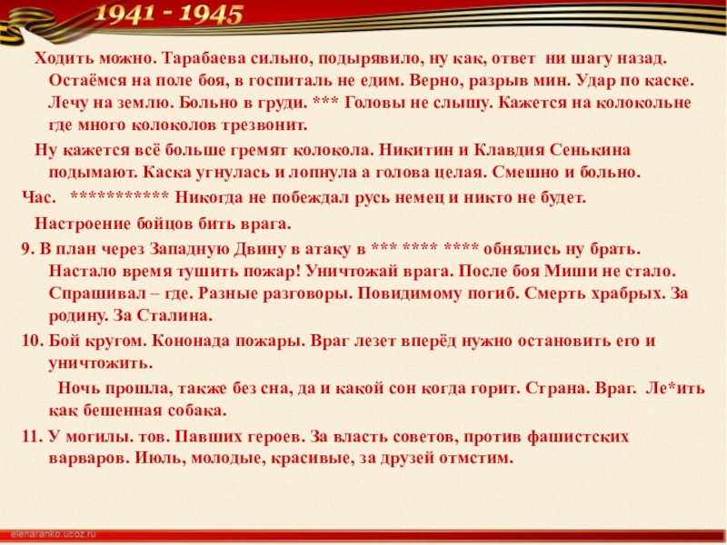 9. В план через Западную Двину в атаку в *** **** **** обнялись ну брать. Настало время тушить пожар! Уничтожай врага. После боя Миши не стало. Спрашивал – где. Разные разговоры. Повидимому погиб. Смерть храбрых. За родину. За Сталина.