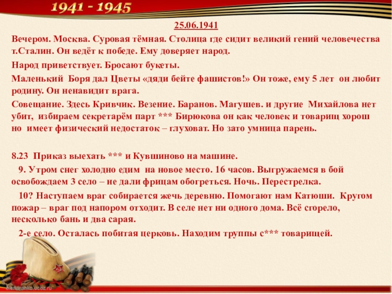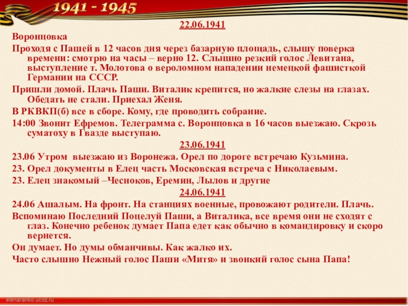 поверка времени: смотрю на часы – верно 12. Слышно резкий голос Левитана, выступление т. Молотова о вероломном нападении немецкой фашисткой Германии на СССР.
