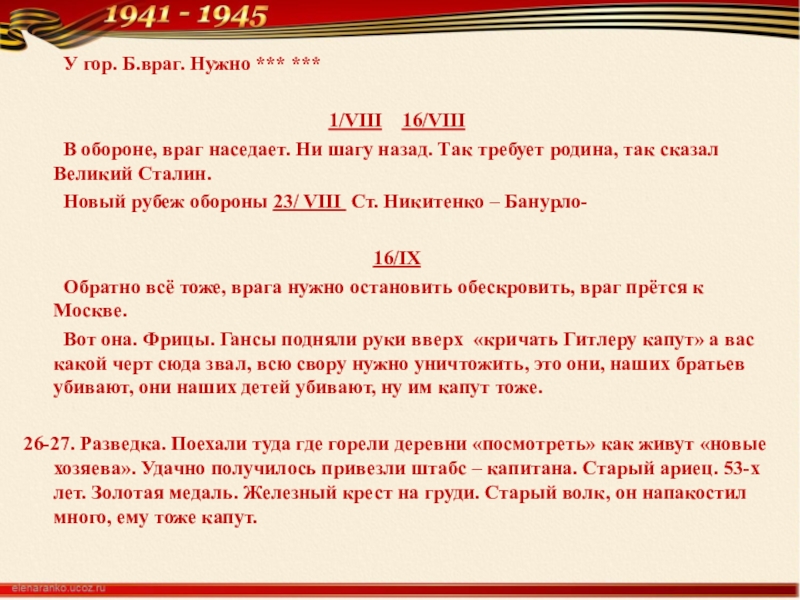 26-27. Разведка. Поехали туда где горели деревни «посмотреть» как живут «новые хозяева». Удачно получилось привезли штабс – капитана. Старый ариец. 53-х лет. Золотая медаль. Железный крест на груди. Старый волк, он напакостил много, ему тоже капут.