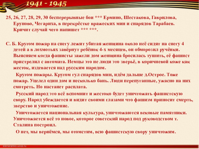 С. Б. Кругом пожар на снегу лежит убитая женщина около неё сидят на снегу 4 детей а в лохмотьях завёрнут ребёнок 4-х месяцев, он обморозил ручёнки. Выясняем когда фашисты зажгли дом женщина бросилась тушить, её фашист пристрелил с автомата. Немцы это не люди это зверьё, в коричневой коже как жесток, издевается над русским народом.