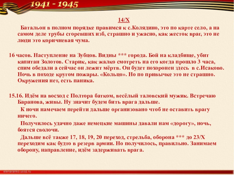 16 часов. Наступление на Зубцов. Видны *** города. Бой на кладбище, убит капитан Золотов. Старик, как жалко смотреть на его когда прошло 3 часа, спим обедали а сейчас он лежит мёртв. Он будет похоронен здесь в с.Исаково. Ночь в походе кругом пожары. «Кольцо». Но по привычке это не страшно. Окружения нет, есть паника.