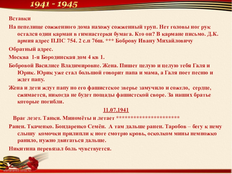 рук остался один карман в гимнастерки бумага. Кто он? В кармане письмо. Д.К. армия адрес П.ПС 754. 2 с.п 76ш. *** Боброву Ивану Михайловичу
