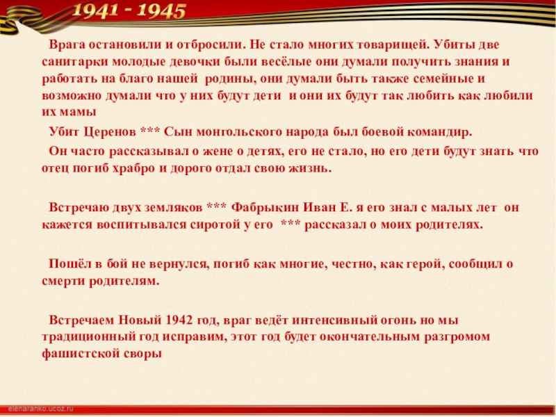Слайд 11 Врага остановили и отбросили. Не стало многих товарищей. Убиты две санитарки