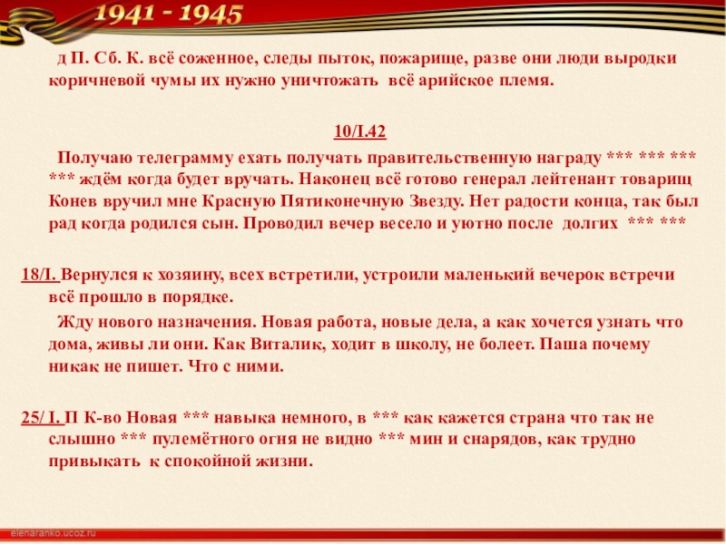 Получаю телеграмму ехать получать правительственную награду *** *** *** *** ждём когда будет вручать. Наконец всё готово генерал лейтенант товарищ Конев вручил мне Красную Пятиконечную Звезду. Нет радости конца, так был рад когда родился сын. Проводил вечер весело и уютно после долгих *** ***