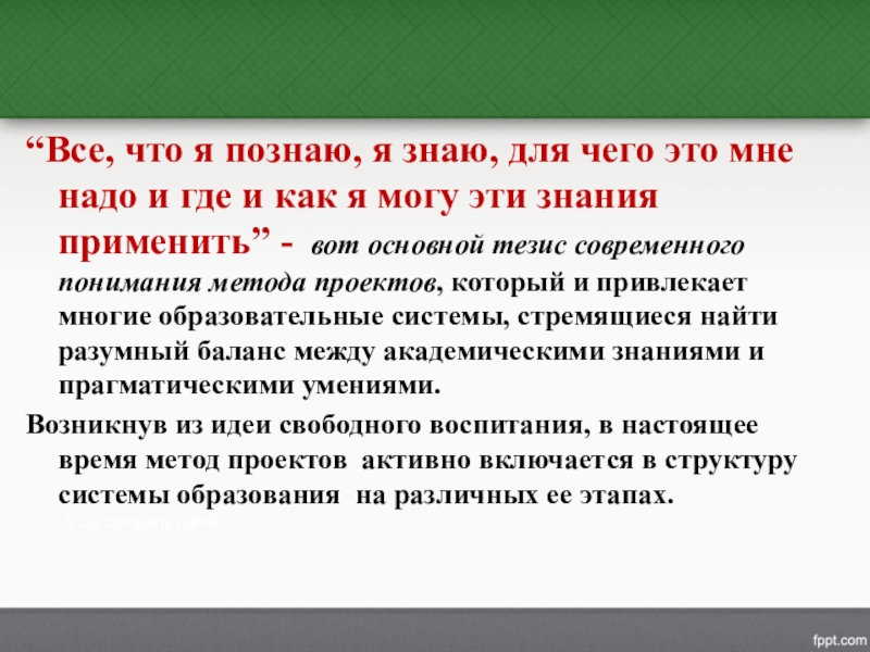 и где и как я могу эти знания применить” - вот основной тезис современного понимания метода проектов, который и привлекает многие образовательные системы, стремящиеся найти разумный баланс между академическими знаниями и прагматическими умениями.