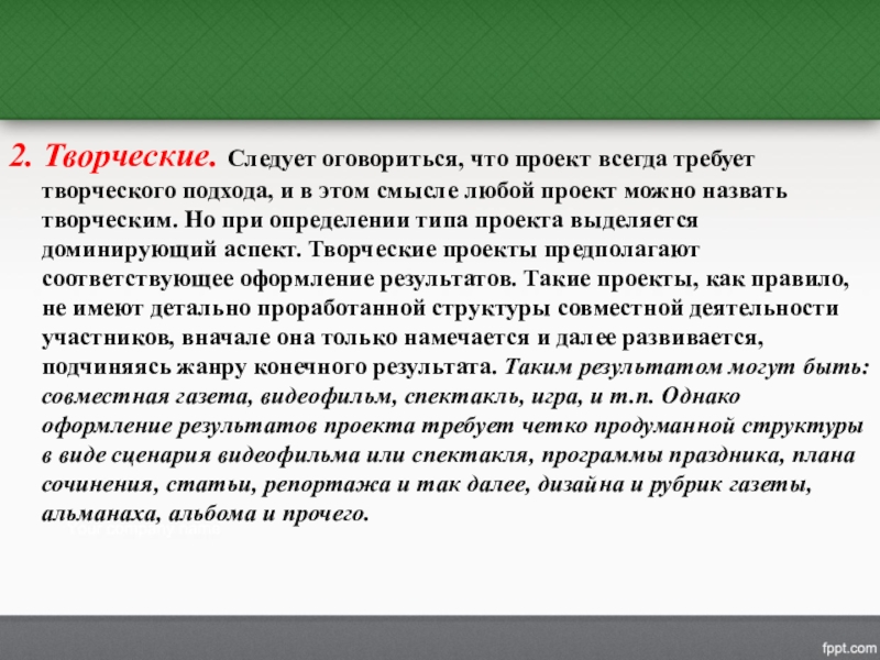 в этом смысле любой проект можно назвать творческим. Но при определении типа проекта выделяется доминирующий аспект. Творческие проекты предполагают соответствующее оформление результатов. Такие проекты, как правило, не имеют детально проработанной структуры совместной деятельности участников, вначале она только намечается и далее развивается, подчиняясь жанру конечного результата. Таким результатом могут быть: совместная газета, видеофильм, спектакль, игра, и т.п. Однако оформление результатов проекта требует четко продуманной структуры в виде сценария видеофильма или спектакля, программы праздника, плана сочинения, статьи, репортажа и так далее, дизайна и рубрик газеты, альманаха, альбома и прочего.