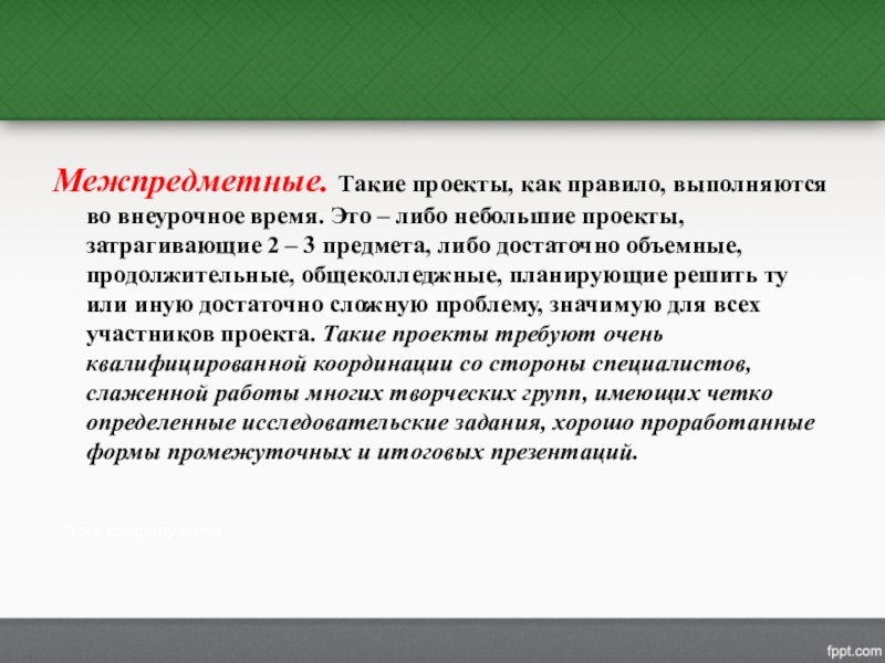 Слайд 27Межпредметные. Такие проекты, как правило, выполняются во внеурочное время. Это –