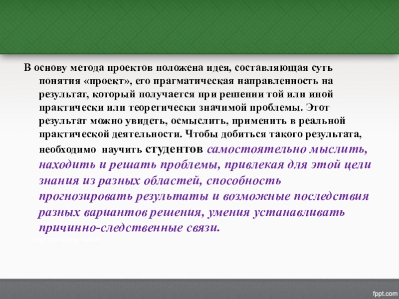 Слайд 8В основу метода проектов положена идея, составляющая суть понятия «проект», его