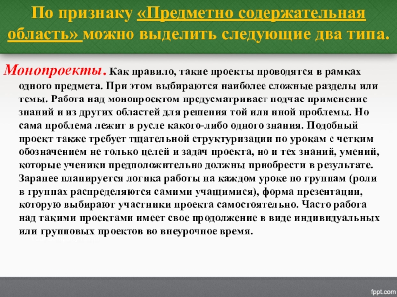 правило, такие проекты проводятся в рамках одного предмета. При этом выбираются наиболее сложные разделы или темы. Работа над монопроектом предусматривает подчас применение знаний и из других областей для решения той или иной проблемы. Но сама проблема лежит в русле какого-либо одного знания. Подобный проект также требует тщательной структуризации по урокам с четким обозначением не только целей и задач проекта, но и тех знаний, умений, которые ученики предположительно должны приобрести в результате. Заранее планируется логика работы на каждом уроке по группам (роли в группах распределяются самими учащимися), форма презентации, которую выбирают участники проекта самостоятельно. Часто работа над такими проектами имеет свое продолжение в виде индивидуальных или групповых проектов во внеурочное время.