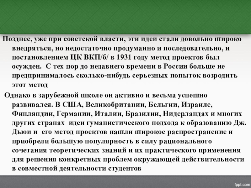 но недостаточно продуманно и последовательно, и постановлением ЦК ВКП/б/ в 1931 году метод проектов был осужден. С тех пор до недавнего времени в России больше не предпринималось сколько-нибудь серьезных попыток возродить этот метод
