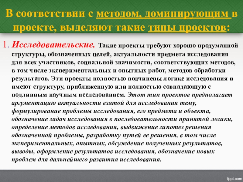 Исследовательские. Такие проекты требуют хорошо продуманной структуры, обозначенных целей, актуальности предмета исследования для всех участников, социальной значимости, соответствующих методов, в том числе экспериментальных и опытных работ, методов обработки результатов. Эти проекты полностью подчинены логике исследования и имеют структуру, приближенную или полностью совпадающую с подлинным научным исследованием. Этот тип проектов предполагает аргументацию актуальности взятой для исследования тему, формулирование проблемы исследования, его предмета и объекта, обозначение задач исследования в последовательности принятой логики, определение методов исследования, выдвижение гипотез решения обозначенной проблемы, разработку путей ее решения, в том числе экспериментальных, опытных, обсуждение полученных результатов, выводы, оформление результатов исследования, обозначение новых проблем для дальнейшего развития исследования.
