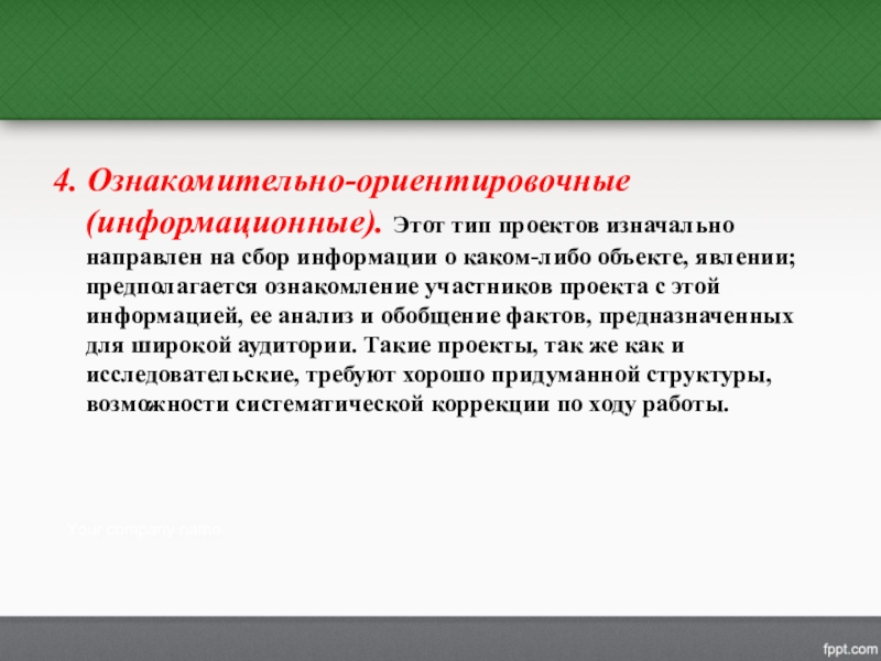 Слайд 234. Ознакомительно-ориентировочные (информационные). Этот тип проектов изначально направлен на сбор информации
