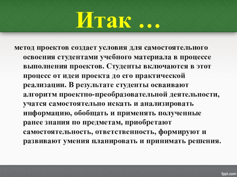 метод проектов создает условия для самостоятельного освоения студентами учебного материала