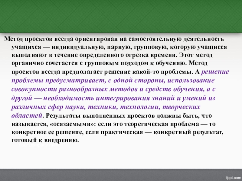 Слайд 9 Метод проектов всегда ориентирован на самостоятельную деятельность учащихся — индивидуальную,