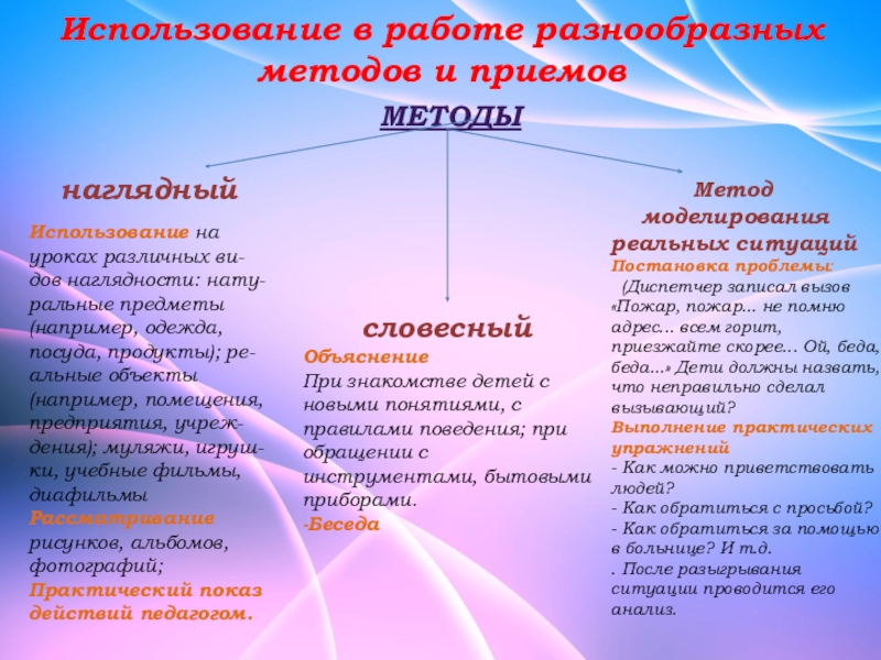Использование на уроках различных ви-дов наглядности: нату-ральные предметы (например, одежда, посуда, продукты); ре-альные объекты (например, помещения, предприятия, учреж-дения); муляжи, игруш-ки, учебные фильмы, диафильмы