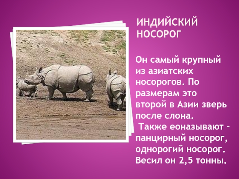 Также еоназывают - панцирный носорог, однорогий носорог. Весил он 2,5 тонны.
