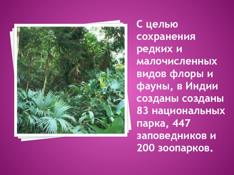 С целью сохранения редких и малочисленных видов флоры и фауны, в Индии созданы созданы 83 национальных парка,