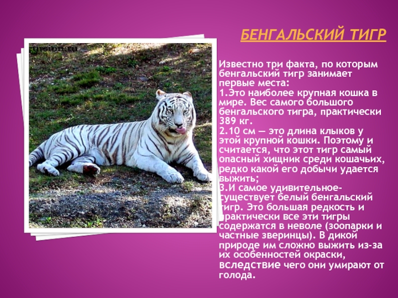 3.И самое удивительное-существует белый бенгальский тигр. Это большая редкость и практически все эти тигры содержатся в неволе (зоопарки и частные зверинцы). В дикой природе им сложно выжить из-за их особенностей окраски, вследствие чего они умирают от голода.