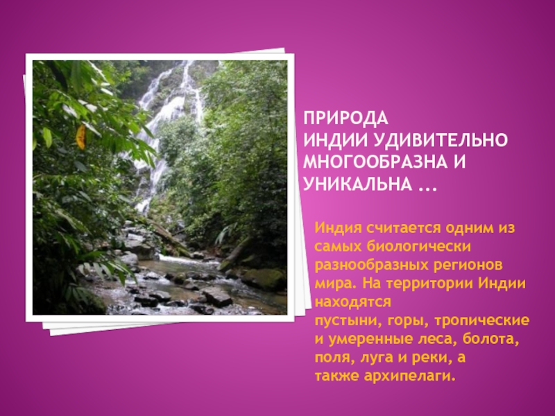Природа Индии удивительно многообразна и уникальна ... Индия считается одним из самых биологически разнообразных регионов мира. На территории Индии находятся пустыни, горы, тропические и умеренные леса, болота, поля, луга и реки, а также архипелаги.