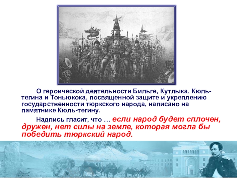 Слайд 15 О героической деятельности Бильге, Кутлыка, Кюль-тегина и Тоньюкока, посвященной защите и