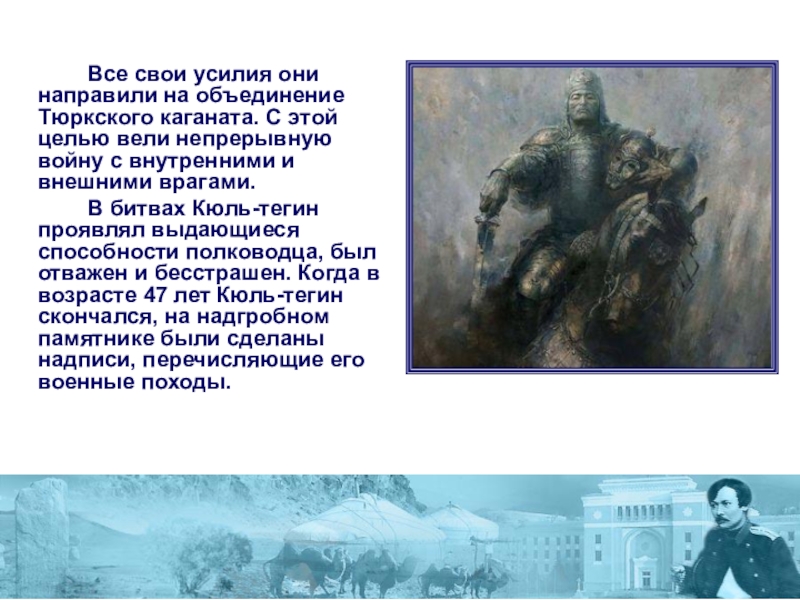 Слайд 6 Кюльтегин (684 - 731 гг.) - полководец, известный батыр. Младший сын