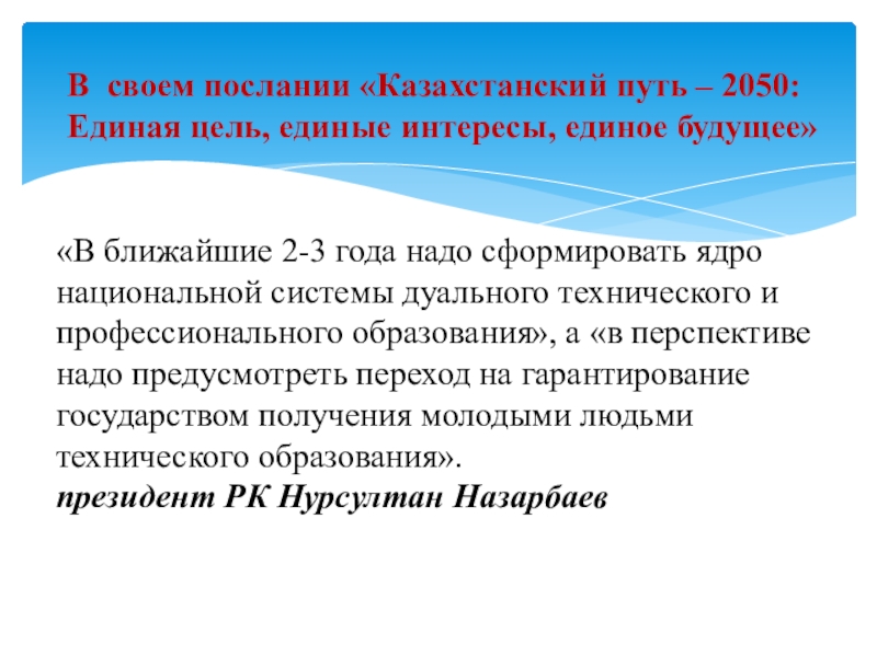 В своем послании «Казахстанский путь – 2050: Единая цель, единые интересы, единое будущее»