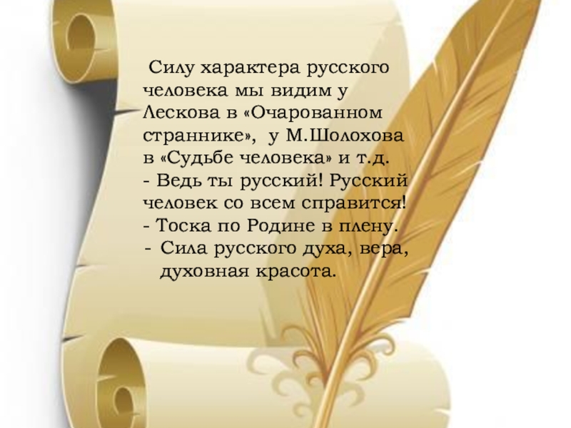 Слайд 6 Силу характера русского человека мы видим у Лескова в «Очарованном