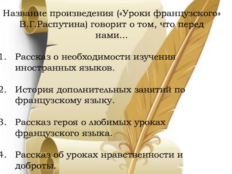 Слайд 11Название произведения («Уроки французского» В.Г.Распутина) говорит о том, что перед нами…
