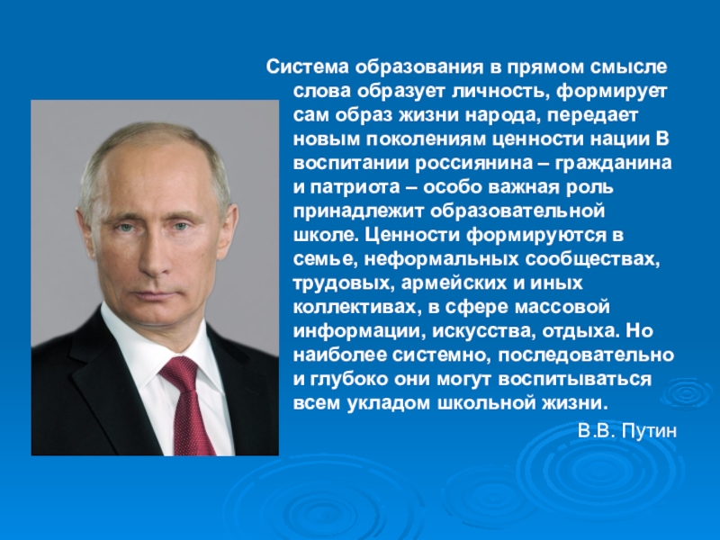 жизни народа, передает новым поколениям ценности нации В воспитании россиянина – гражданина и патриота – особо важная роль принадлежит образовательной школе. Ценности формируются в семье, неформальных сообществах, трудовых, армейских и иных коллективах, в сфере массовой информации, искусства, отдыха. Но наиболее системно, последовательно и глубоко они могут воспитываться всем укладом школьной жизни.
